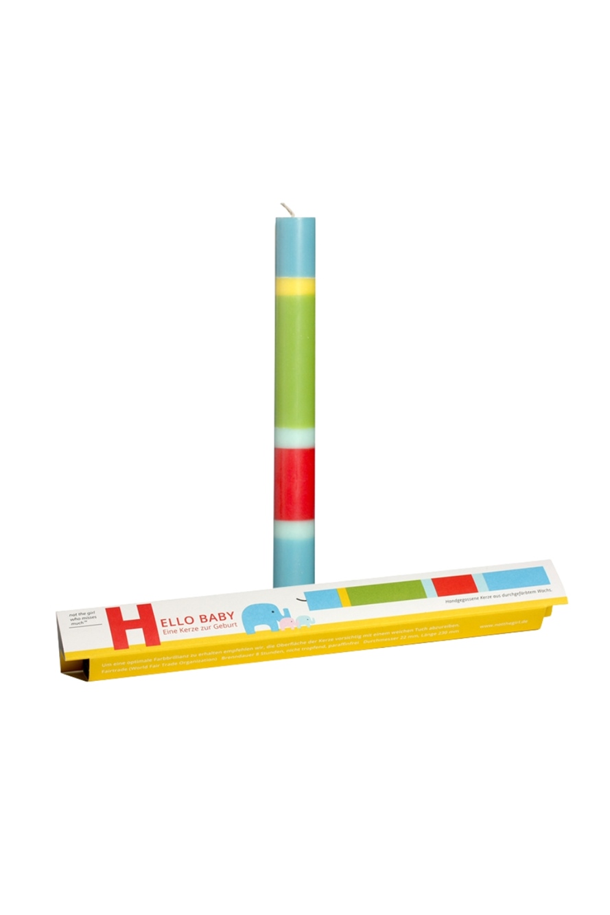 Sanft und farbenfroh: Die Kerze Hello Baby von Not The Girl wird aus pflanzlichem Wachs handgefertigt. Jede Kerze ist ein Unikat und kommt in einer schönen Verpackung – ein liebevolles Geschenk zur Geburt oder Taufe.
