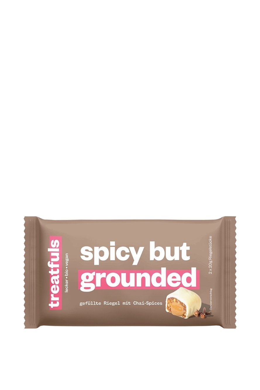 Spicy but Grounded bringt cozy Vibes ins Snack-Regal. Zimt, Kardamom, Ingwer und Datteln verschmelzen zu einem warm-würzigen Riegel mit Soul-Food-Charakter. Mit Haselnuss-Füllung und weißem Kakaobutter-Überzug – bio, vegan und ohne Zucker-Drama.
