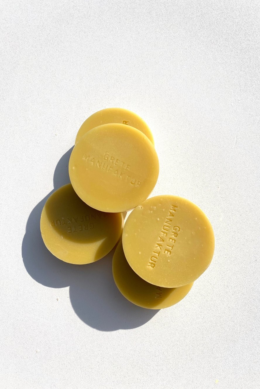 Die INGA Seife in leuchtendem Gelb duftet frisch nach Lemongrass mit einer leicht kräuterigen Note von Geranium. Die handgemachte Pflegeseife eignet sich für Hände und Körper – auch ideal zum Duschen.