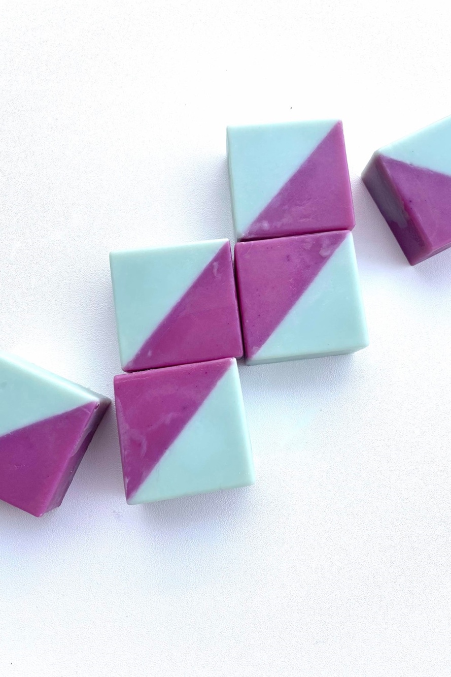 Die kleine geometrische RONJA Seife ist ein echter Hingucker: zwei bunte Dreiecke in Lila und Grün, handgemacht und ideal für normale Haut. Ihr kompaktes, eckiges Format passt auch in kleine Hände – perfekt für Groß und Klein. Der frische Limonenduft rundet das Wascherlebnis angenehm ab – dezent, nicht aufdringlich. Mit ihrem basischen pH-Wert (8–10) unterstützt sie zusätzlich das natürliche Gleichgewicht der Haut.