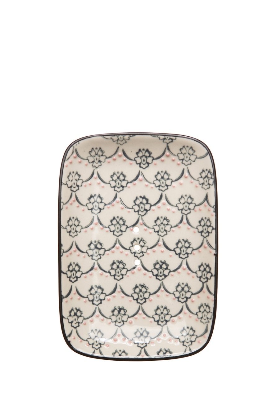 Diese Seifenschale bringt Muster ins Bad – mit handgestempeltem Print, abgerundeter Rechteckform und praktischen Ablauflöchern. Jedes Stück ein Unikat.