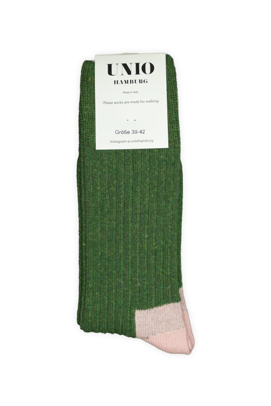 Die CITY-Socken von UNIO Hamburg vereinen feinste Merinowolle, weiche Viskose und einen Hauch Kaschmir – für ein angenehm leichtes, warmes und elastisches Tragegefühl. Die Farbkombination aus Grün und Rosé setzt einen frischen Akzent. In weiteren Farben erhältlich.