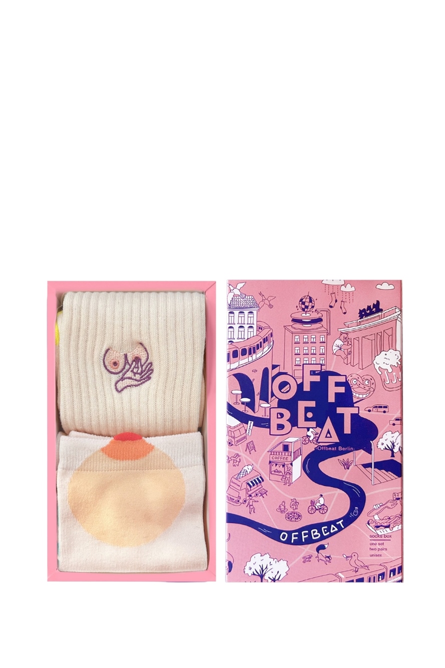 Zwei Sockenpaare, ein klarer Fokus: Brüste. Die Geschenkbox „Boobs“ bringt doppelte Portion Humor ins Spiel – mit einem Paar gestickter Socken und einem Paar im Allover-Print. Für alle, die das Leben nicht zu ernst nehmen. 100% Spaß, garantiertes Kichern inklusive.