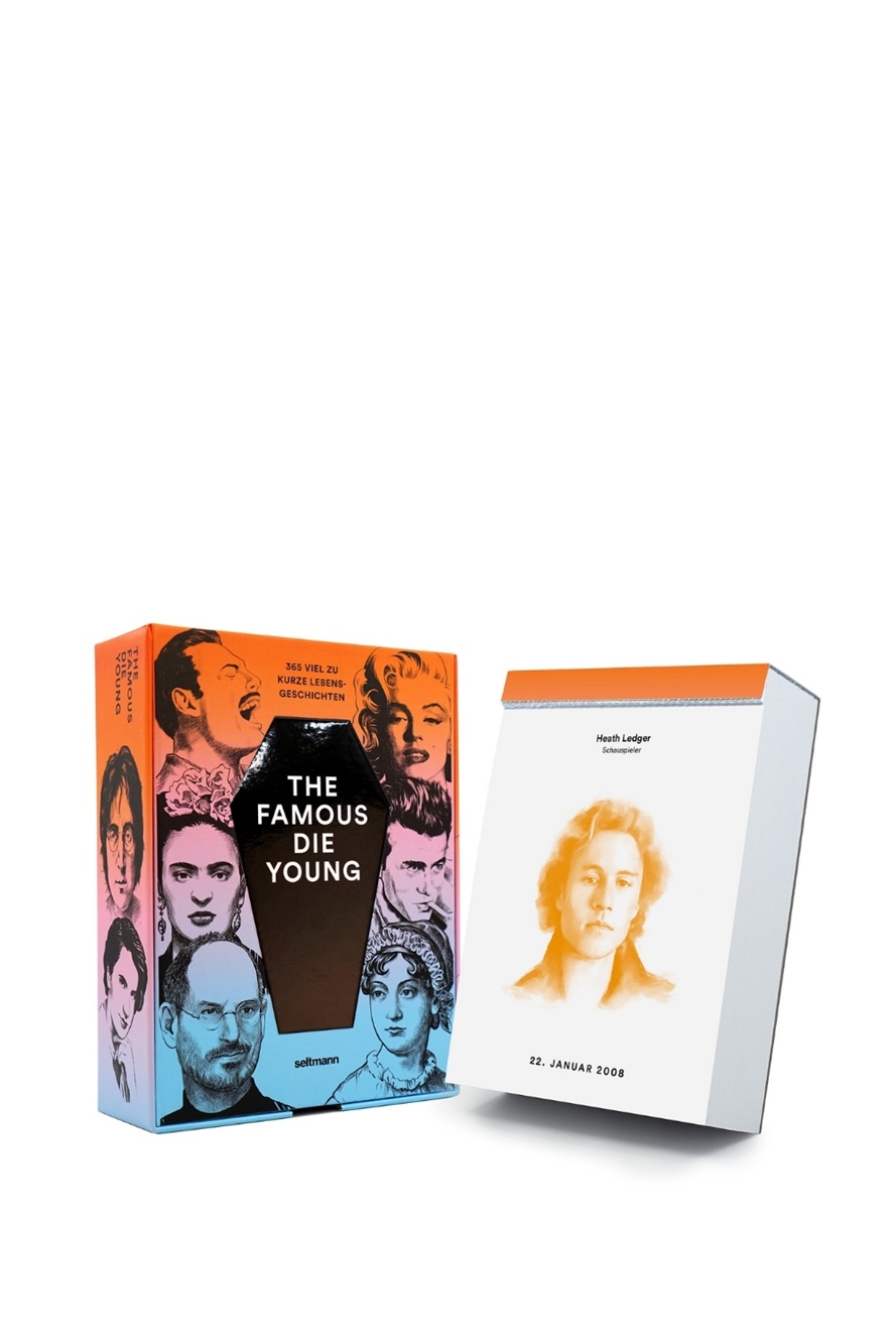 „The Famous Die Young“ – ein immerwährender Tageskalender mit 366 Ikonen und ihren zu kurzen Lebensgeschichten. 365 Todestage, 365 Todesarten, 365 spannend erzählte Biografien: Der Kalender spielt mit der Faszination für tragische, mitunter aberwitzige Todesfälle. An jedem Tag erzählt er die inspirierende Lebensgeschichte einer zu jung gestorbenen Ikone – ob James Dean, Jeanne d’Arc oder Friedrich Schiller. Die Protagonisten sind Pioniere, Genies, mutige Erfinder, gefeierte Stars, gefallene Helden, verarmte Denker, außergewöhnliche Sportskanonen oder musikalische Ausnahmetalente – ein illustrer Kreis wahrer Legenden, die in jungen Jahren Großes leisteten und die Grenzen ihrer Zeit verschoben.