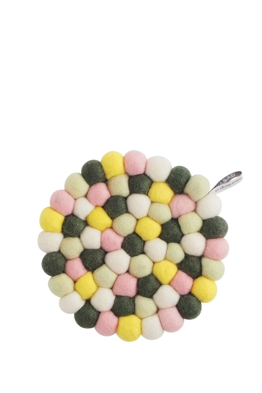 Runder Untersetzer BOTANIQUE – handgefertigt aus 100% Wolle, die sich angenehm weich und dennoch robust anfühlt. Hitzebeständig, schmutzabweisend und mit praktischer Schlaufe zum Aufhängen – schützt Oberflächen und setzt farbige Akzente auf Tisch oder Wand.
